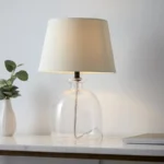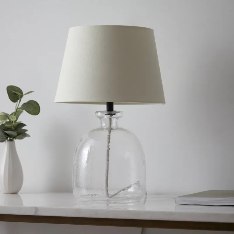 The ideal addition to relaxed classic and traditional interiors. This glass table light features a textured ‘hammered’ effect with matt black metal details, natural fabric flex and a ivory fabric shade.