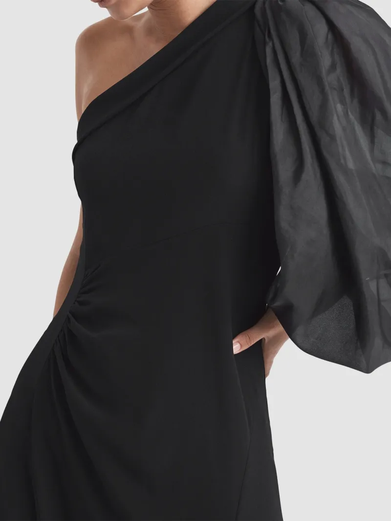 A contemporary guise informs the black Maeve midi dress. Note its asymmetric one-shoulder design fitted with a sheer, voluminous sleeve. The bodice is cinched with ruche detailing and it falls to a natural midi length. Choose our new-season strappy heels for a stunning, monochrome outlook.Satin-backed fabrication One-shoulder design Sheer, blouson sleeve Ruche detailing Midi length Front slipBodycon fit