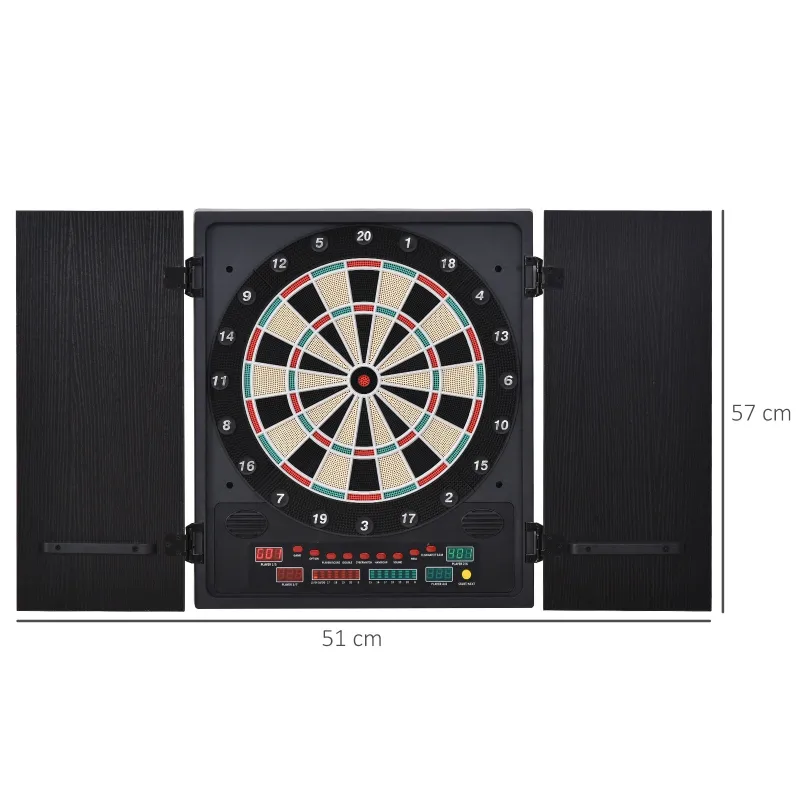 Bring classic game fun to the home with this LED dartboard from HOMCOM. A luxe design which features a dartboard in a two door casing to protect the board when not in use. The inside of the doors hold the darts for safe keeping. A large catchment area allows any missed-spot darts to collect and avoid damaging any other areas. The LED panel on the bottom keeps track of the score so you don’t lose track, with 27 games and 202 different scoring options. Volume is adjustable.