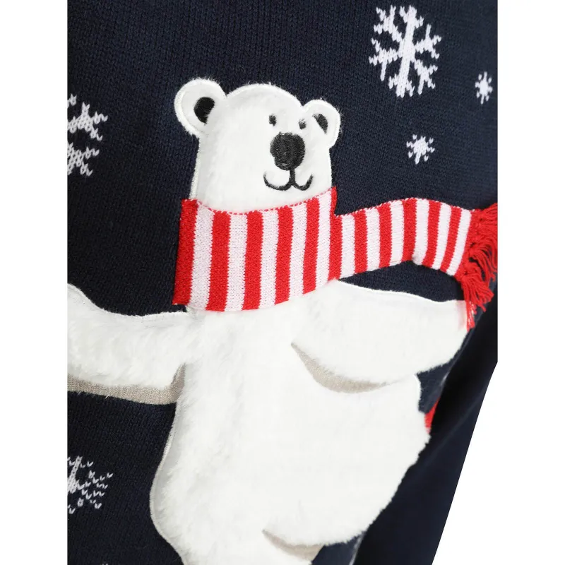 This soft knit, crew neck mens Christmas jumper features a white fluffy polar bear with a striped red and white scarf, ice skating wearing red skates with snowflakes falling in the background to complete that festive look.