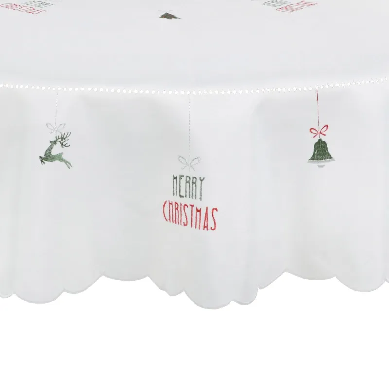 These tablecloths are available in grey or white with embroidered red, green and silver “Merry Christmas” text, reindeers Christmas trees and stars.