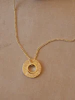 Open disc pendant with textured surface. Handconstructed from Recycled & Traceable Materials. Brass base plated with Gold.
