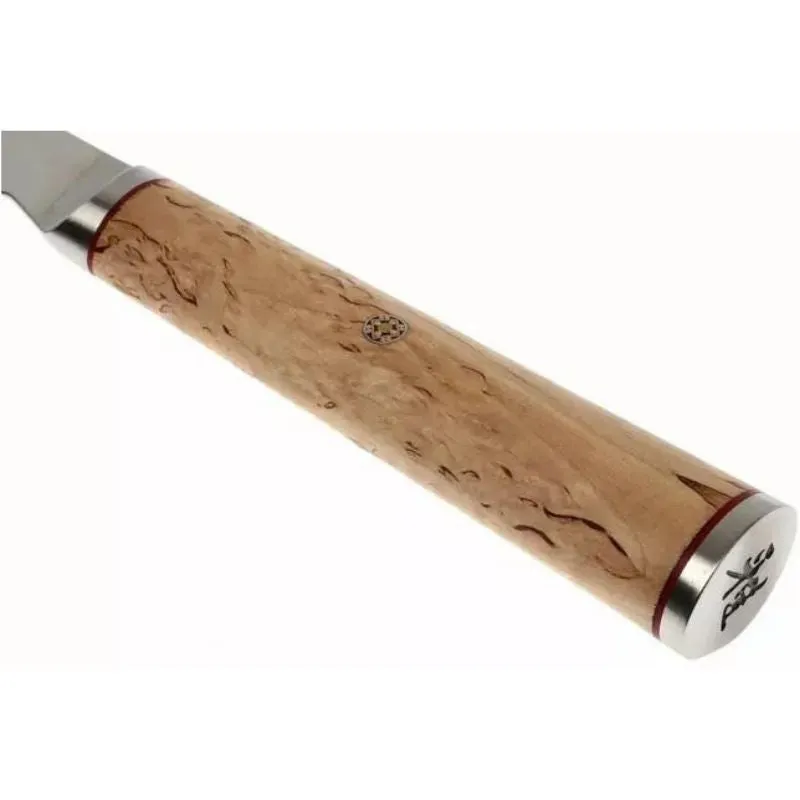 The D-shaped handle is made from Masur birch wood. This wood has a beautiful natural pattern, which makes every knife unique. There is a magnificent mosaic pin in the middle of the handle – another stunning detail that highlights this collection’s superior finish and attention to detail. The warmth of the natural wood also contrasts nicely with the Damascus steel blade. And, as the star attraction, the Miyabi logo is beautifully engraved on the back of the handle.