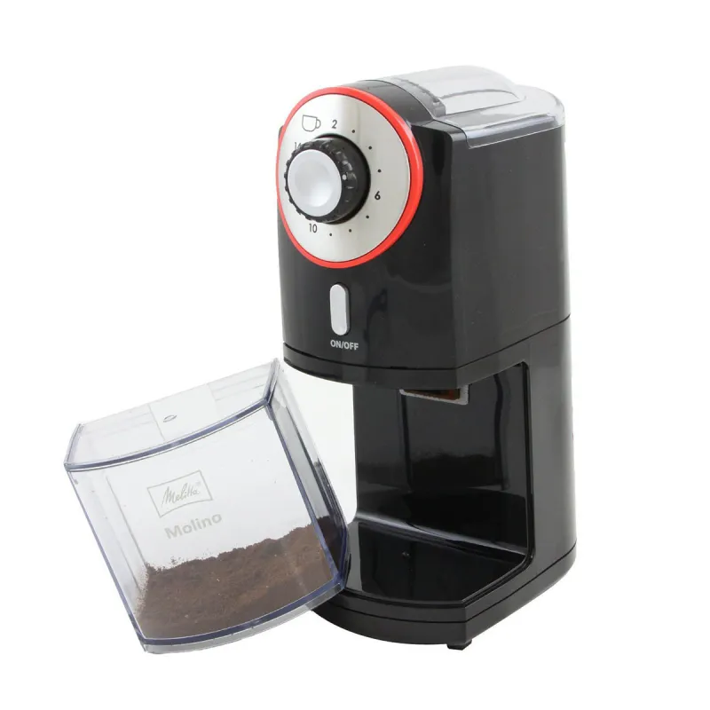 The Melitta Molino Electrical Coffee Grinder Black grinds coffee for upto 14 cups. with removable containers for beans and ground coffee for eacy use and cleaning.