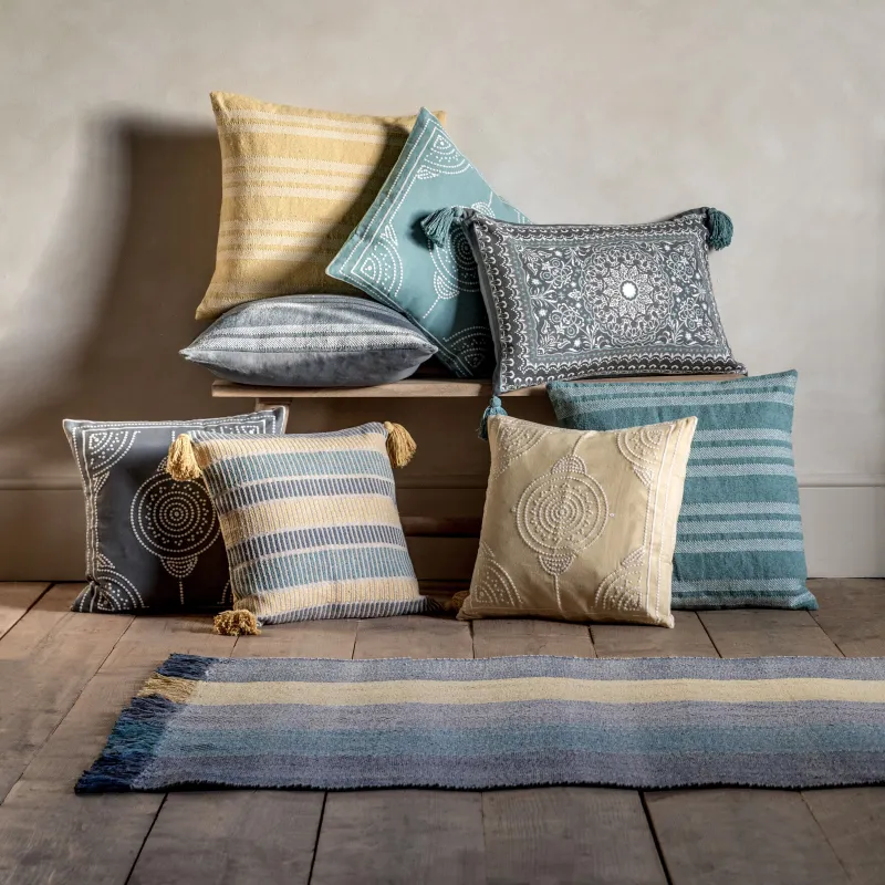 A simple yet effective mandala embroidered cushion in a stunning soft summer colour.