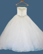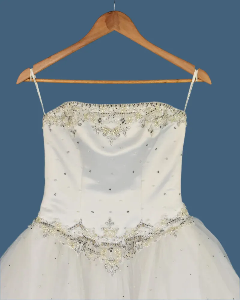 This wedding dress is white in colour and features various sequins, beads and pearls. The bodice has a straight neckline with beautiful beading detailing. The bodice is dotted with sequins with beading detail to the waist. From the waist the dress flows into a full-length netted A-line skirt with added sequins for added sparkle. The hemline of the skirt is sequinned. The back of the dress has a zip fastening with fabric buttons to hide the zip.