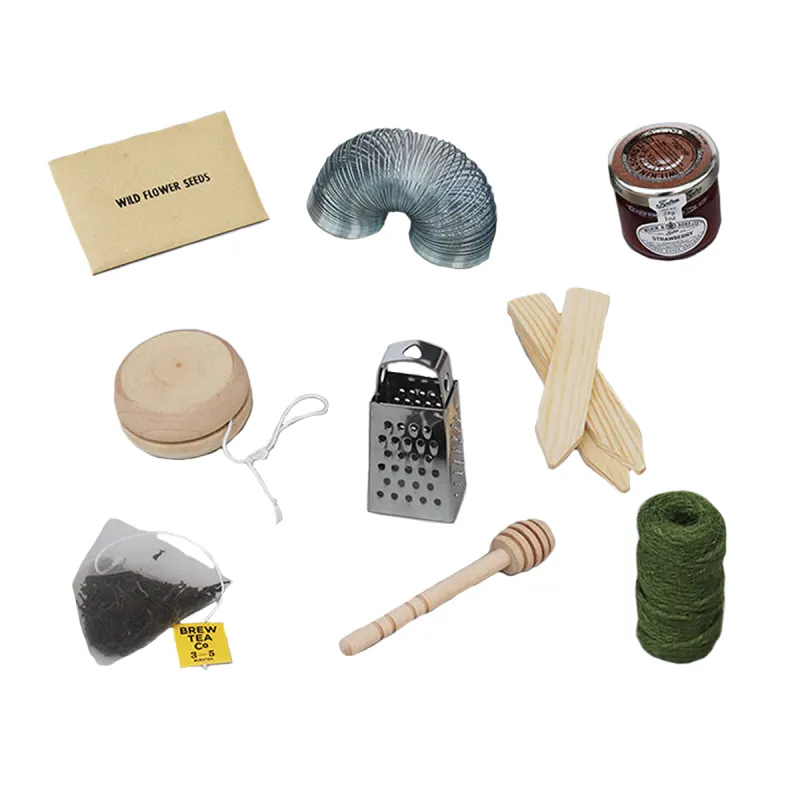 Gifts include 1 of each of the following: wooden honey drizzler, nutmeg grater, mini strawberry jam, luxury tea, wild flower seeds, wooden plant labels, metal slinky, garden twine and a wooden yoyo. Each cracker also includes a paper crown, joke and conventional snap!