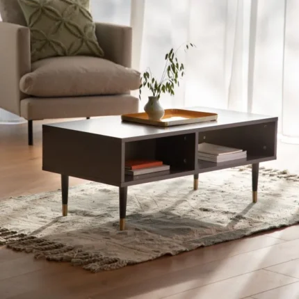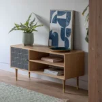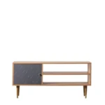 This lovely Media Unit makes an unusual eye-catching feature piece, with a combination of a painted grey finish and natural oak veneer. The unit combines colour and shape to great effect, with a routed geometric circular pattern, reminiscent of Bauhaus design, on the painted door. A brass handle on the cupboard door is complemented by brass ‘socks’ on the solid oak legs. The unit is also available in white, and the collection also includes other matching and coordinating pieces.\n\nThe collection of living furniture is part of our Packed-Flat Design Project, offering easy delivery to any room in any property, whilst reducing the packaging needed. Easy assembly is required, but all the tools needed are supplied.