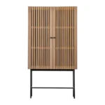 This unique collection offers a range of living, dining and bedroom furniture with a beautiful contemporary Japandi style. Crafted from solid oak and oak veneers, great attention to detail has been given to the design across the range to create these stunning pieces.\n\nThis 2 door cocktail cabinet features beautiful, slatted doors, crafted from solid oak. Black metal legs and base with matching handles add the finishing touch.