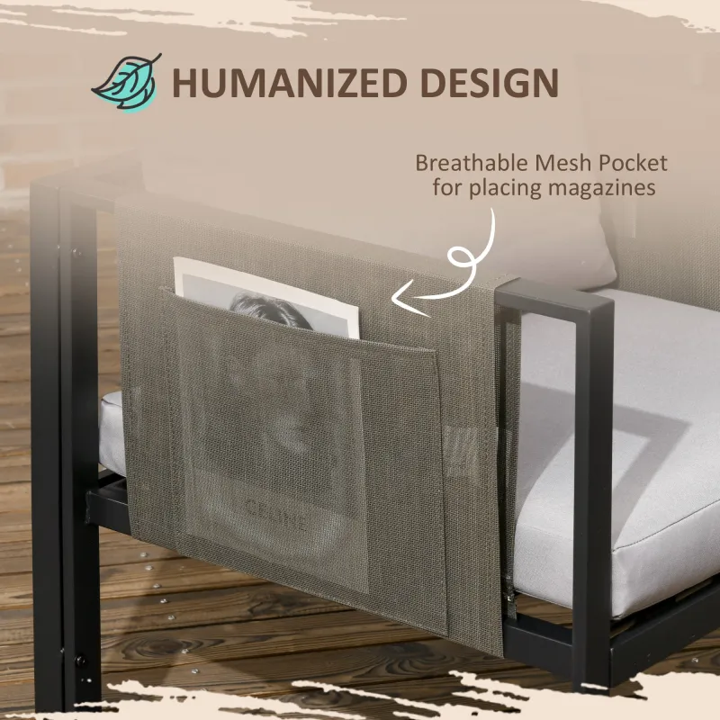 Outsunny 4 Piece Metal Garden Furniture Set with Tempered Glass Coffee Table, Texteline Pocket, Outdoor Patio Set Loveseat Single Armchairs with Padded Cushions, Light Grey