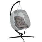 Outsunny Hanging Egg Chair Outdoor Indoor Garden Swing Chair with Folding Basket, Garden Hanging Chair with Stand, Thickened Cushion, Cup Holder for Patio, Balcony, Sand Brown