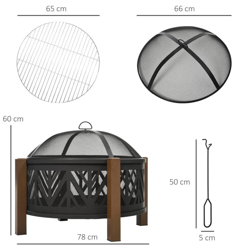 - 500℃ RESISTANT STEEL: A sturdy structure, which can withstand a high temperature for better use. Four feet, attached to the side make the fire pits for garden balance. COOKING GRATE: A place to hold food and protect you from naked flames.