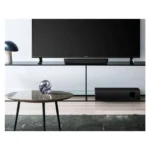 Its compact design sits comfortably between the TV stands, fitting nicely under the TV frame and integrating with the TV. The simple and elegant curved form matches the ensemble, and its slim subwoofer can be installed either vertically or horizontally. If horizontal, it can also be placed in a TV rack.