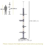PawHut Floor to Ceiling Cat Tree for Indoor Cats 5-Tier Kitty Tower Climbing Activity Center Scratching Post Adjustable Height 230-260 cm Grey