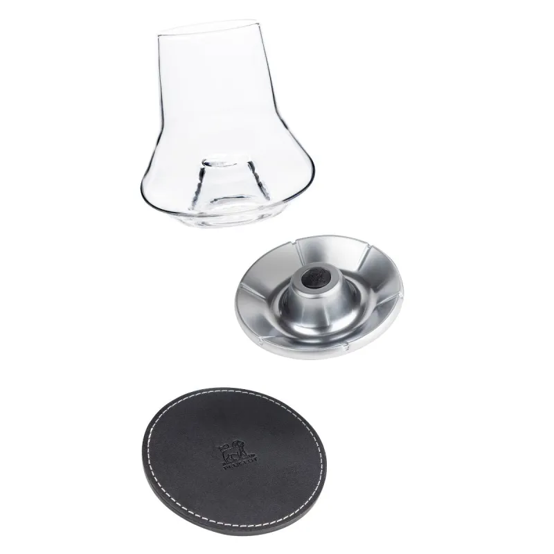 The Peugeot Whisky Tasting Set is perfect for whisky enthusiasts who seek a complete and refined tasting experience. This set includes a specially designed whisky glass and a cooling base, crafted to enhance the aroma and flavor of your favorite whiskies. Keep the cooling base in the freezer for a few hours before use; it chills the whisky to between 5 and 8 degrees Celsius, allowing you to fully appreciate its color and aroma. The shape of the glass is designed to develop and release the complexities of the whisky’s aroma, providing a sensory adventure with every sip.