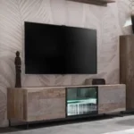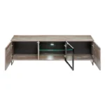 This TV Cabinet will be the ideal storage solution for an industrial-style interior, complementing it with its design. It is made from high-quality laminated board, highly resistant to scratches, mechanical damage and impacts, as well as moisture and UV rays. It features three hinged doors and an LED-equipped glass shelf that forms a pair of open compartments.