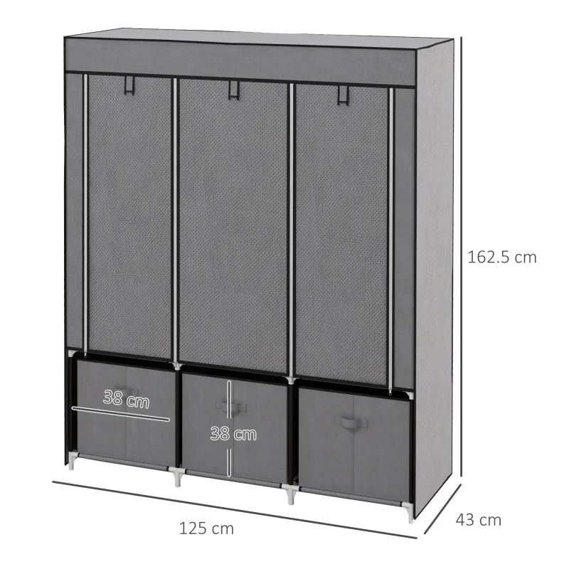 Keep your bedroom neat and tidy with this HOMCOM fabric wardrobe. Designed with a mix of hanging space, shelves and drawers, it’s perfect for storing everything from coats and dresses to folded jumpers and accessories. The powder-coated steel frame gives it a sturdy build, while the fabric cover helps protect your clothes from dust. A great choice for spare rooms, rentals or anywhere you need extra storage without the bulk of traditional wardrobes.