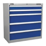 Industrial quality, five drawer, freestanding cabinet. Drawers run on heavy-duty ball-bearing slides with load bearing of up to 75kg and are fitted with safety locking catches. Each drawer is fitted with removable dividers running front to back and then supplied with cross dividers for personalised storage layout. Fitted with high quality lock and two coded keys.