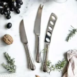 A 3 piece cheese knife set from the timeless Radford Bright cutlery range .
