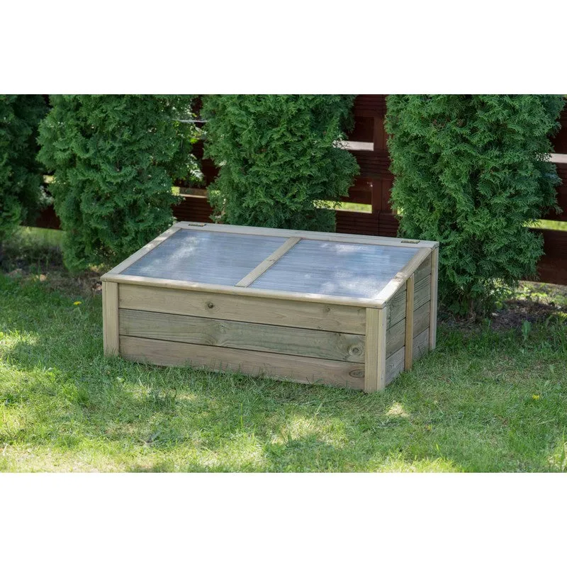The Wooden Cold Frame is an ideal product to nurture seedlings outdoors and also protect plants from the elements and colder temperatures. A useful feature is a hinge to prop the roof open whilst working in the frame whilst the polycarbonate roof keeps the unit watertight once shut. All timber within the cold frame is FSC certified and pressure-treated in a natural green finish, protecting the product from wood rot and fungal decay.