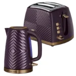 The Russell Hobbs Groove Kettle and 2 Slice Toaster Kitchen Set in Mulberry Purple and Gold Accents