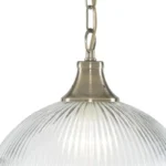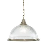 This American Diner antique brass pendant light looks beautiful on any ceiling, with simplicity and style inspired by the era of the classic American Diner. The clear ribbed glass diffuser provides clean lighting effects, which are perfect for your dining area, or any other room, and the matching metal trim finished in antique brass completes the look.