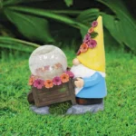 Silver & Stone Outdoor Solar Jinxie Wheelbarrow Gnome with Yellow Hat with Pink Flowers – Crackle Ball Solar Effect- Yellow Hat with Pink Flowers