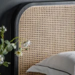 Dramatic statement style sure to become a modern classic. The solid black stand oak frame combines comfort and style ease, with curved corner headboard featuring a woven rattan panel creating a stunning stand out contrast of colours and materials. Available in 4’6″ and 5″ sizes.