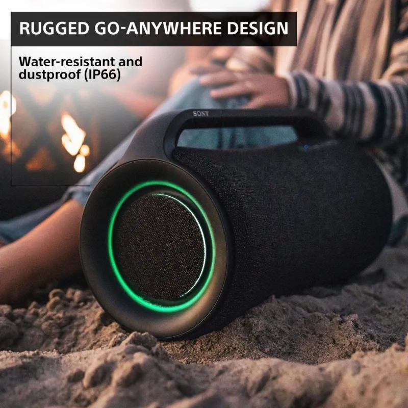 Sony has built the SRSXG500B to last. P66 water resistant and dust proof, this speaker is ready for just about anything. Listen by the pool, at the beach or in the park – the choice is yours. A handle has been included for comfortable transportation.