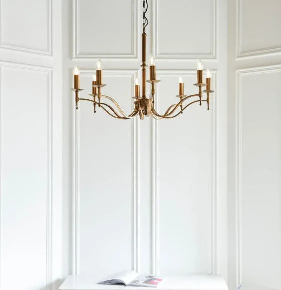 This elegant 8 light pendant from the Stanford antique brass range has beautifully curved arms and simple clean detailing. Matching items available