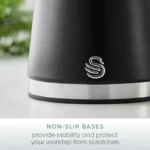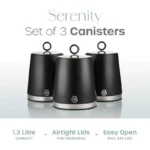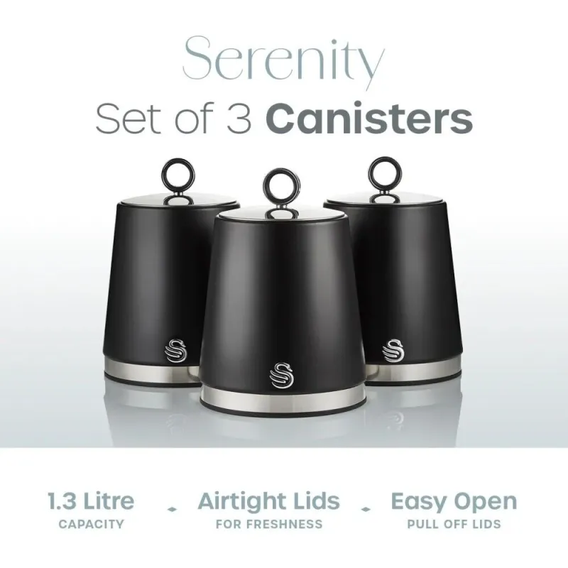 Introduce the Swan Serenity SWKA18536BLK set of 3 black storage canisters to your everyday kitchen collection. Each canister features a 1.3 litre capacity, letting you store large amounts of tea, coffee, sugar or other loose ingredients on your kitchen worktop, all while protecting the contents from dust or moisture. The lids include large sturdy steel loops to grip comfortably, providing you with easy access to the contents. These kitchen canisters combine practicality with an elegant design, offering a contemporary colour scheme to fit perfectly amongst any kitchen decor. All canisters have non-slip feet for added stability and to protect your worktop from scratches. The canisters form part of the Swan Serenity breakfast and storage collection. Swan has been providing high-quality household appliances and kitchenware to millions of homes across the UK for over 100 years