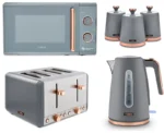 Brand New Tower Cavaletto Kitchen Set of 6 in Grey & Rose Gold with 1.7L Jug Kettle, 4 Slice 1800W Toaster, 800W 20L Microwave & Set of 3 Tea, Coffee & Sugar Canisters Set