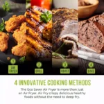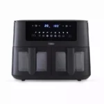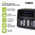 The Tower T17151 Dual Air Fryer features dual baskets, offering maximum air frying versatility for cooking single portions or full family meals. With two 4L baskets and a combined 8L capacity, this fryer can handle all your cooking needs. The convenient match cook function ensures both baskets cook at the same temperature, while 9 one-touch presets make cooking a breeze. Say goodbye to deep frying and hello to perfectly crispy and healthy food with this fryer. Plus, the crisper grill plate allows you to grill like a pro while the bake function lets you get creative with cakes, tarts, and pies. Watch your food cook to perfection through the Vizion viewing windows.