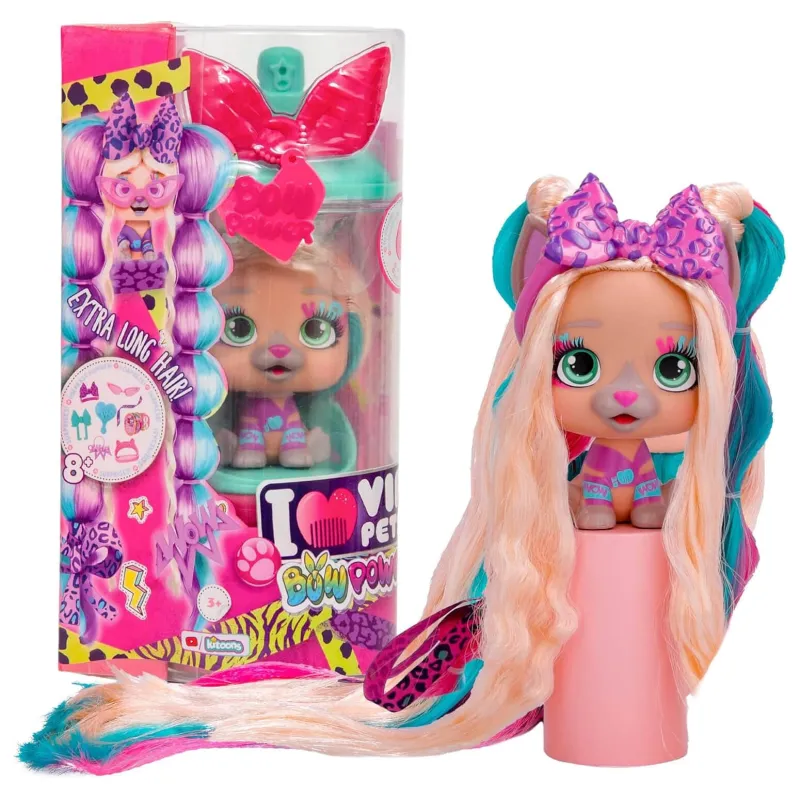 With bold fashions and colourful bows, fans and collectors will love this VIP Pets Bow Power pet figure. The VIP pet comes in a transparent hairspray bottle with lots of accessories in the base. Each dog figure has 30cm long, brightly coloured hair for creative styling using the ribbon and bow themed hairdressing accessories included. The VIP Pets series 6 doll is available in a choice of characters to collect. Suitable for children age 4 years and over.