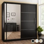 Discover the ideal blend of fashion and functionality with the VISTA 203cm Sliding Door Wardrobe in Black. Featuring a sleek, modern design, this wardrobe offers generous storage options with versatile customization opportunities. The matte finish is available in Black, White, and Oak, while the interior is fully customizable with additional hanging rails. Whether you prefer a half-shelving, half-hanging configuration or all hanging, the VISTA wardrobe has you covered. Choose the location of your shelves, whether it’s on one side or in the middle, to suit your unique storage needs.