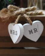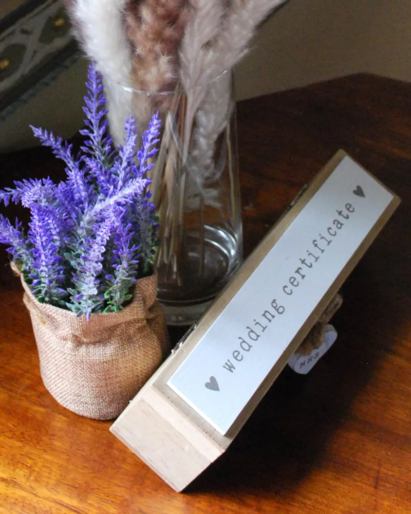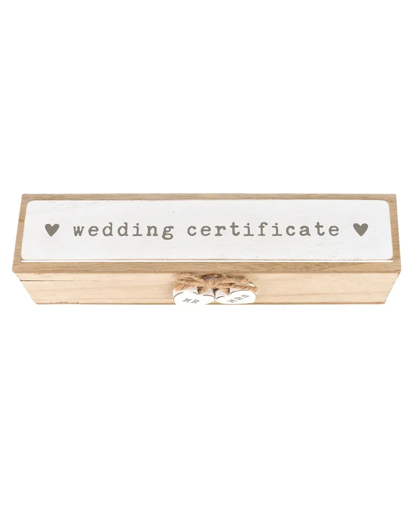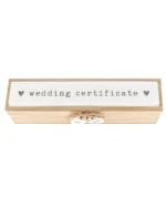 This wedding certificate holder has been well designed. In a natural wood with a 3D effect white plaque printed with ‘ wedding certificate’ in grey. Complete with 2 dangly white heart embellishments. Both printed in a grey typewriter style font with ‘Mr ‘and ‘Mrs’.