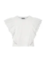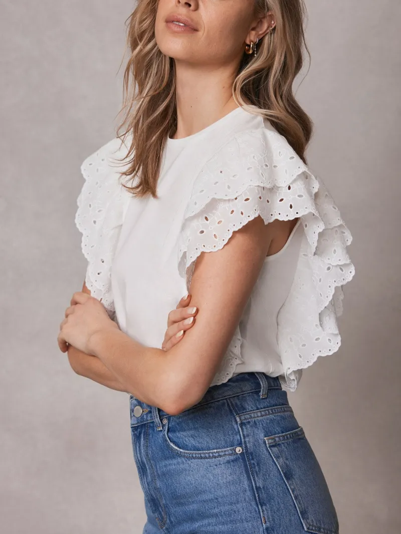 White top featuring a crew neckline and layered, ruffle Broderie cap sleeves.
