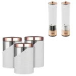 White & Rose Gold Tea, Coffee, Sugar Canisters & Electric Salt/Pepper Mills Set