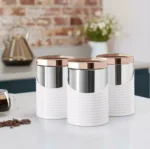 Made of high quality polished stainless steel and featuring elegant, rose gold accents, this set of 3 storage canisters from Tower is perfect for conveniently keeping large quantities of coffee, sugar and tea on your kitchen countertop. Featuring air-tight lids, your contents will be better preserved and kept fresh for longer. Forming part of the Tower Linear range, this set benefits from the trademark outer body protection and boasts subtle rose-gold coated stainless steel lids. These canisters provide a perfect balance of style and functionality, making them an ideal addition to any modern kitchen. This white and rose gold Tower canister set comes with 2 years warranty to provide added peace of mind in the event of a fault