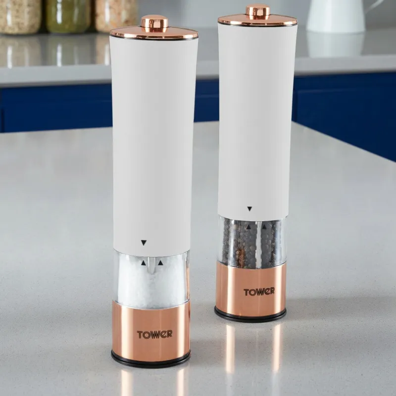 Add seasoning to soups, salads and other meals at the touch of a button with this stylish electric salt and pepper mill set. Suitable for all types of herbs and spices, these mills will efficiently grind peppercorns, rock salt and other common seasonings. The LED light on the base illuminates when in use, allowing you to accurately dispense wherever you want it, while the acrylic viewing window allows you to easily monitor levels and refill when required. The salt and pepper mills are complete with a stylish white and rose gold soft-touch rubberised body for a firm yet comfortable grip. Requires 4 x AA batteries (not included) to operate.