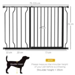 - Dimensions: 76H x 75-115Wcm. Suitable for openings of 75-115cm. Please measure your opening before purchasing. Assembly required. Suitable for small and medium dogs up to 20kg, 39cm in shoulder height.