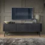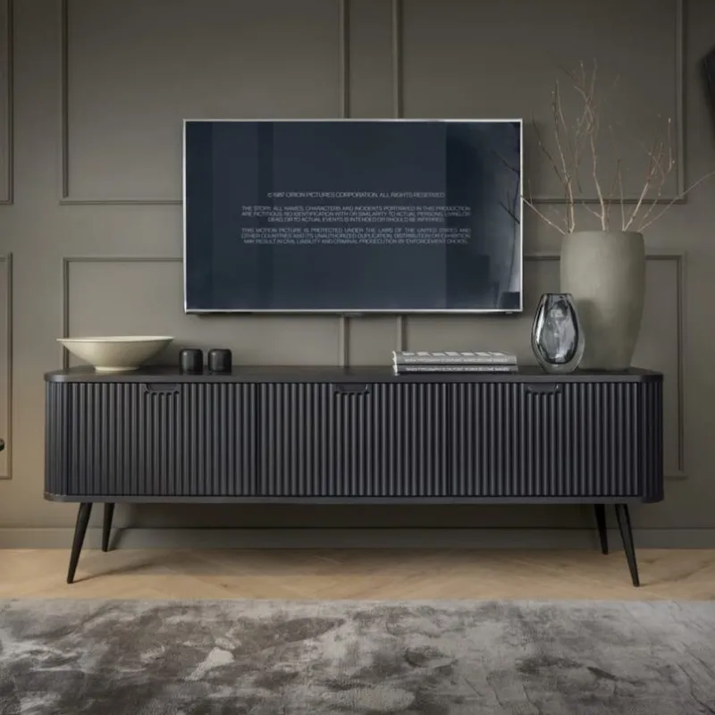 Upgrade your entertainment area with the Zova TV Cabinet 168cm. Designed to accommodate modern systems, its wide and sleek form factors offer a stylish storage solution. With three hinged doors, it keeps media and accessories organized and out of sight, ensuring a clutter-free living space. The cabinet is built from laminated board, enhanced with ABS edging and milled MDF fronts for a contemporary finish. Black metal legs provide stability and add a modern edge, making it a versatile addition to any decor.